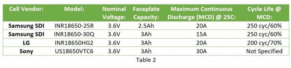 Cordless power tool suppliers work closely with Li-ion battery suppliers to optimize “Maximum Continuous Discharge” (MCD) performance and cost, weight, charge rate, cycle life, capacity, and durability (shock, vibration, and temperature tolerance) Relationship. Table 2 lists several examples of 18650 lithium-ion batteries used in cordless power tools today.